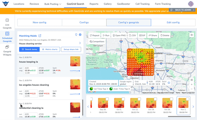 We’ve released some new features since you last heard from us. The best one is probably the custom share links you can make with your scheduled GeoGrid configurations. Up to this point, you’ve had the ability to create compare pages (like this one) that show the first and most recent GeoGrid search results for every term in a configuration. You can adjust the date range once that page loads, but you can see what loads by default by clicking the link we just provided.